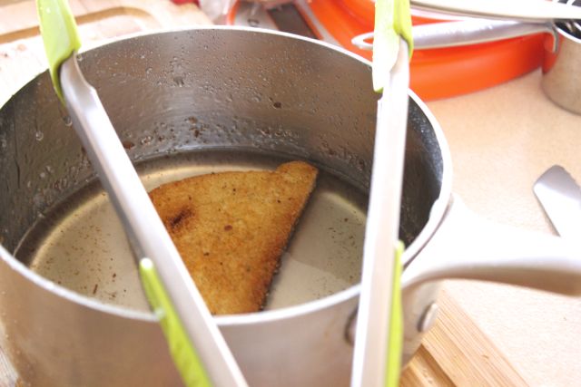 Dip each piece of bread in the hot syrup and lay in the pan.