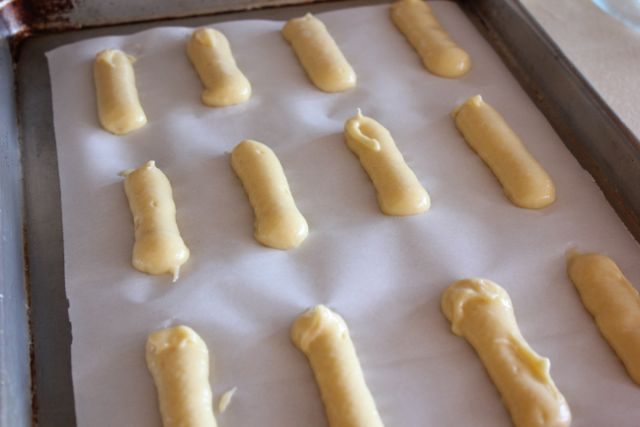 Fill the piping bag with the pastry and pipe out long tubes of about 3"(8cm)
