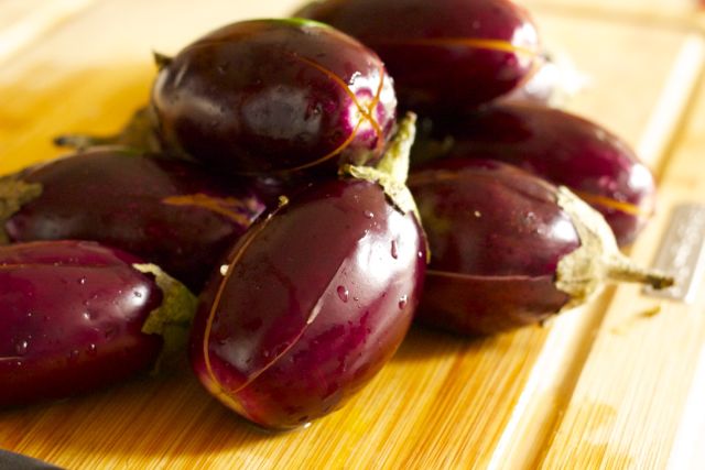 Once you can smell the cumin seeds and the garlic slivers are beginning to turn golden brown, add the eggplants one at a time.