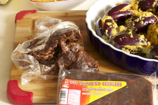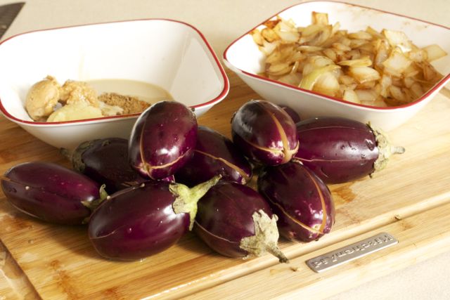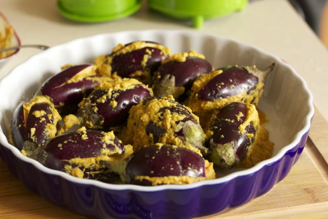 Drain the eggplants and stuff each eggplant in the centre, through the slits, with the masala.