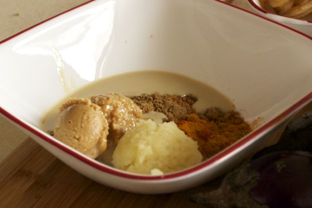 We just want some masala permeating the flesh of the eggplant before we fry them.