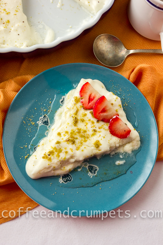 A cold semolina pudding topped with orange blossom scented cream, fresh fruit or nuts and drizzled with syrup
