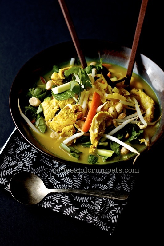 A delicious warming soup with Thai red curry paste chicken and rice noodles, topped off with fresh bean sprouts and herbs.