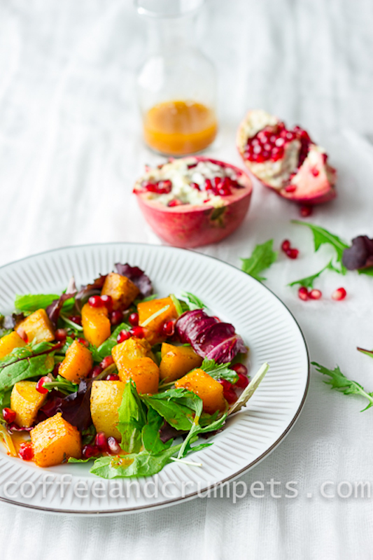 You can use any winter squash or sweet potato that you like. I liked the deep colour of the butternut and the taste of the white sweet potatoes. The pomegranate adds a burst of colour and flavour.