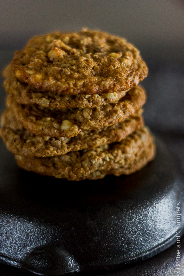 Thick, chewy oatmeal cookie studded with white chocolate morsels and toasted pecans.