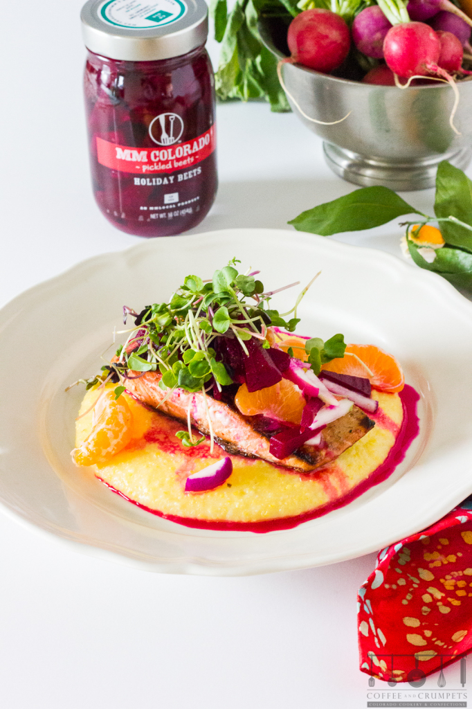 A pickled beet slaw using MM Local Holiday beets and seasonal satsumas served atop salmon and with a roasted burrata.