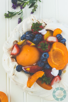 There's no quantity for the fruit, use as much and what you like. Summer time, stone fruits are great to top the pavlova. I used one 8 oz container and it was enough for us and the small meringue shell. If you like more filling, feel free to use more yoghurt or cream.
