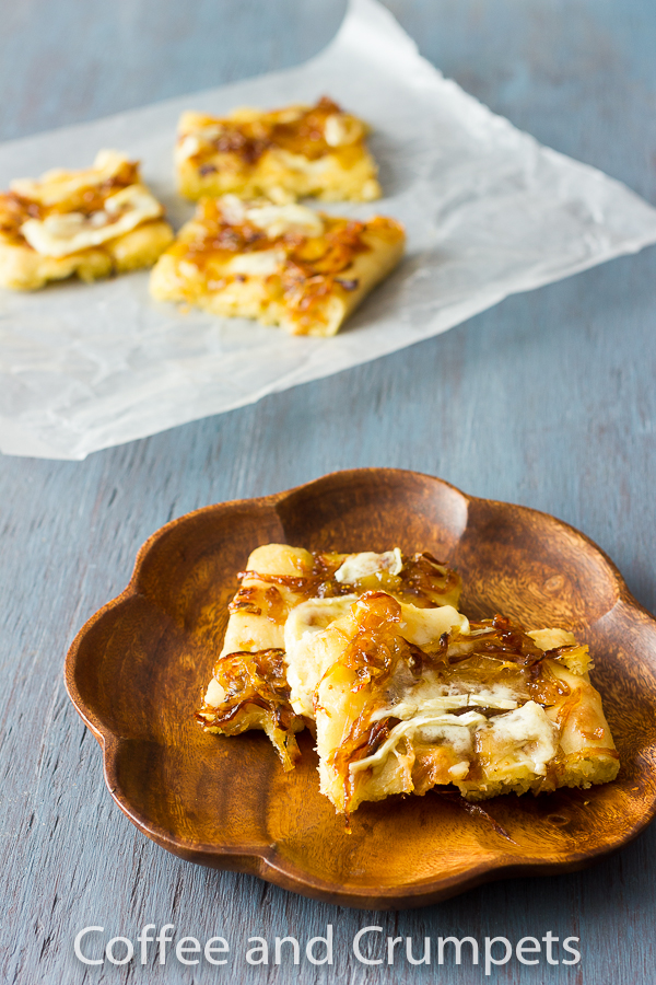 Remove from the oven and spread the top with the fig preserve, add the caramelised onions and place the Brie slices over the top.