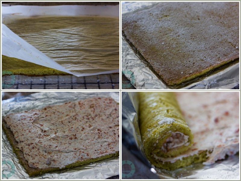 Carefully lift up one the short edges of the cake and start rolling tightly.